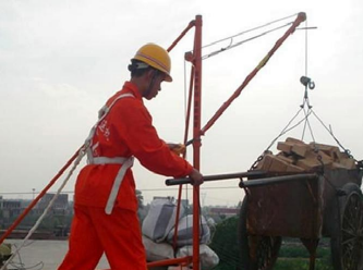 - 工人利用小型吊運機高空吊物時也要系好安全...