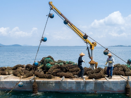 - 陽西縣漁民利用運蠔船上的室外吊運機搬運生...